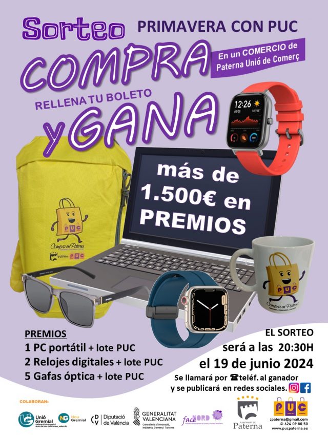 Compra y Gana premios, cuanto más compres en Paterna Unió de comerç (PUC) más premios podrás ganar, el 19 de junio a las 20:30h suerte!!